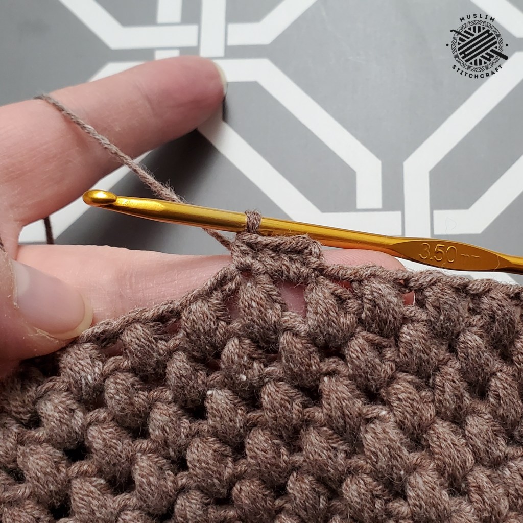 Row 22: CH 2, *HDC 2X into CH 1 SP, HDC into PST. Repeat from * to end, HDC 2X into CH 2