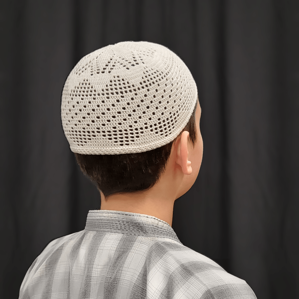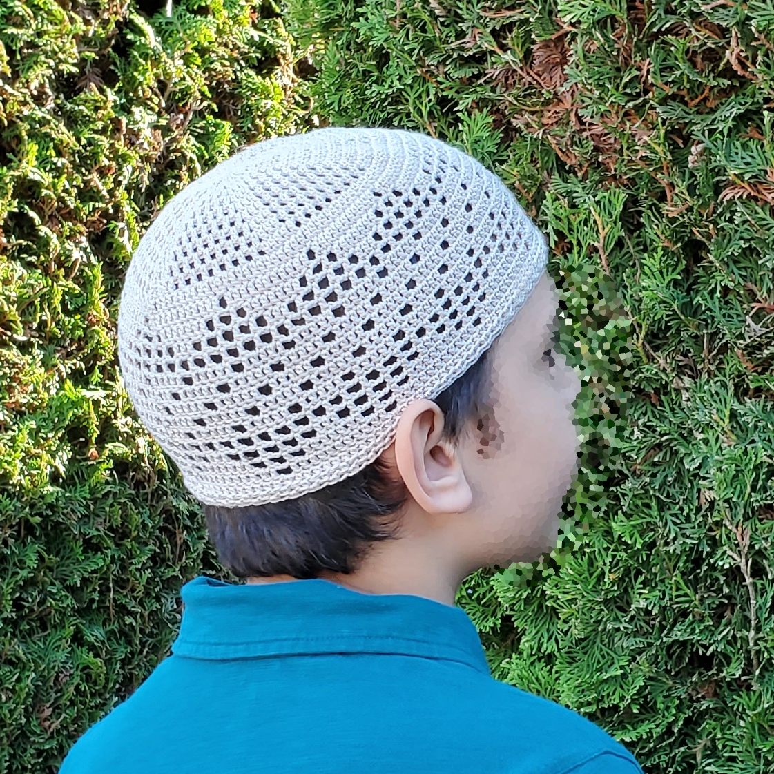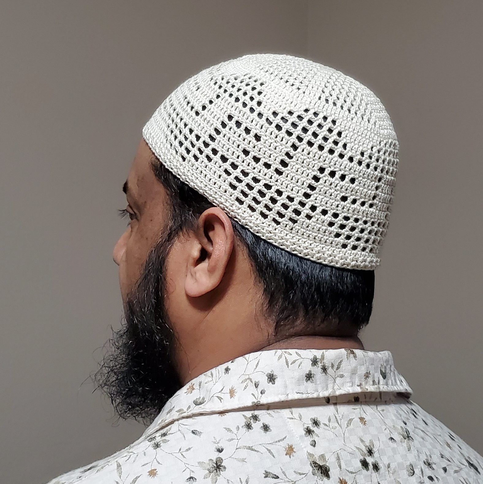 Using size 3 Crochet Thread, this kufi can be worn in any season. It has a thick feel and the filet design leaves negative space to display the pattern.